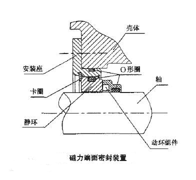 與普通彈簧加載端面密封裝置不同,磁力端面密封裝置取消了彈簧元件,動(dòng)環(huán)與靜環(huán)的緊密貼合是靠自身的磁性吸引力達(dá)到的。靜環(huán)是永磁材料,動(dòng)環(huán)是由碳石墨環(huán)鑲?cè)塑洿挪牧檄h(huán)中構(gòu)成的。靜環(huán)(磁材料)與動(dòng)環(huán)(軟磁材料)之間依靠磁性吸引力保證石墨環(huán)與動(dòng)環(huán)緊密貼合,防止工作流體泄漏。動(dòng)環(huán)與軸之間實(shí)現(xiàn)相對(duì)移動(dòng)的密封,并可軸向和角向浮動(dòng),自動(dòng)補(bǔ)償密封面的磨損。